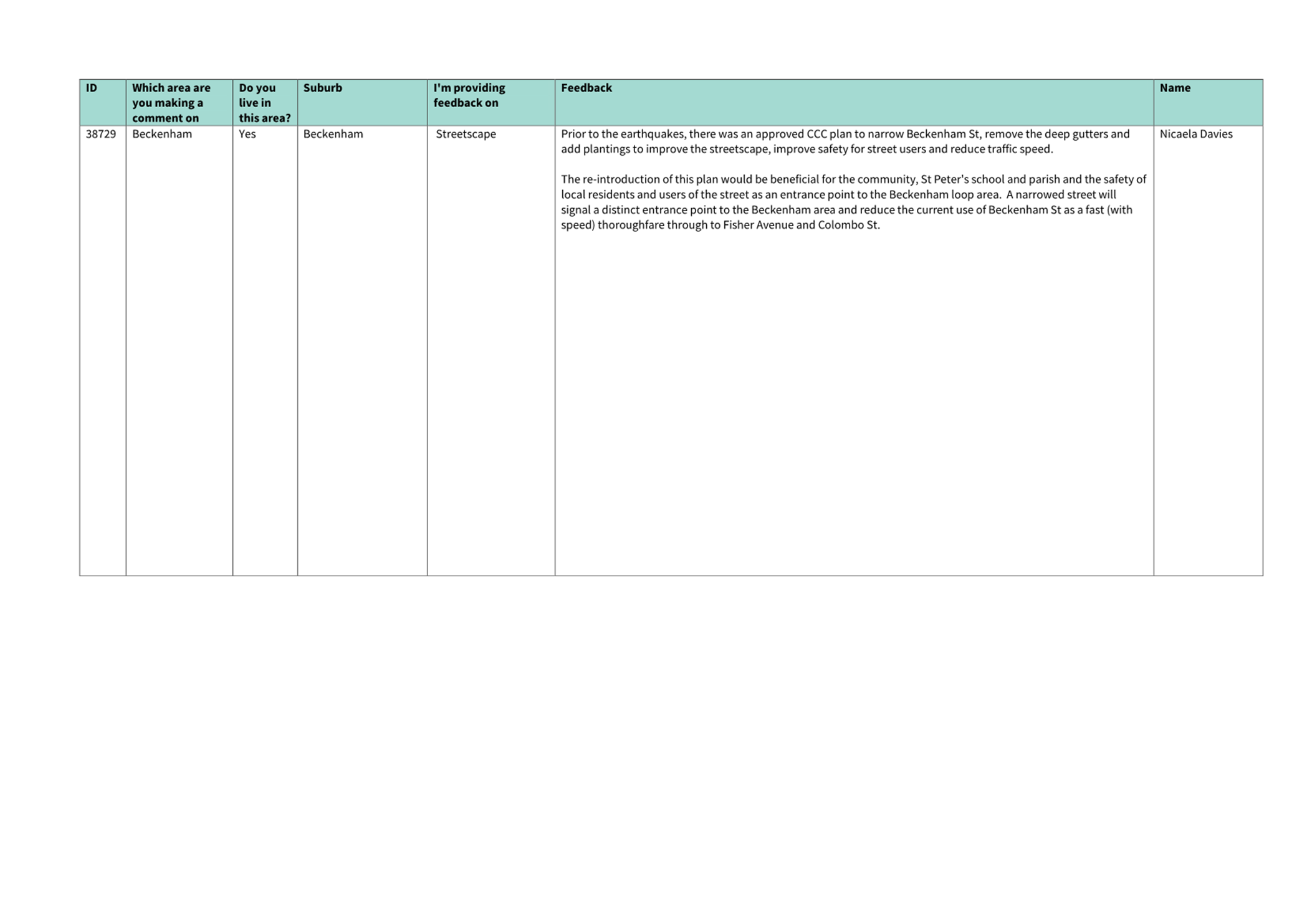5.12 213 submissions were received for the Spreydon, Somerfield, Waltham, and Beckenham area; these came from the ‘Have Your Say’ page, the interactive map, and emails. The submissions can be viewed in Attachment B.