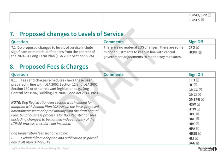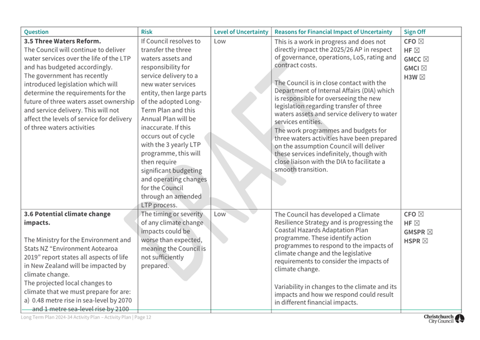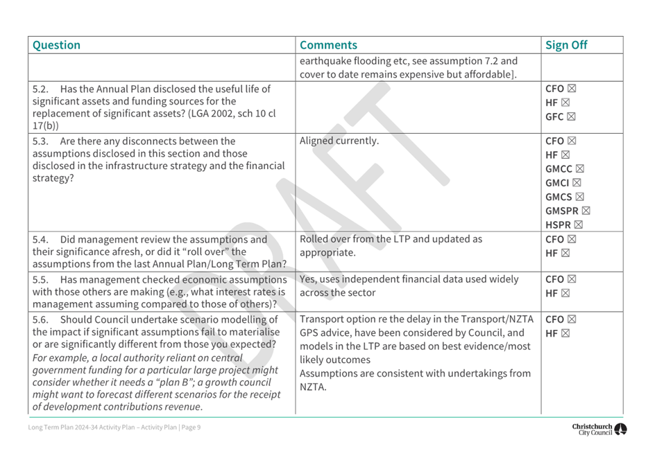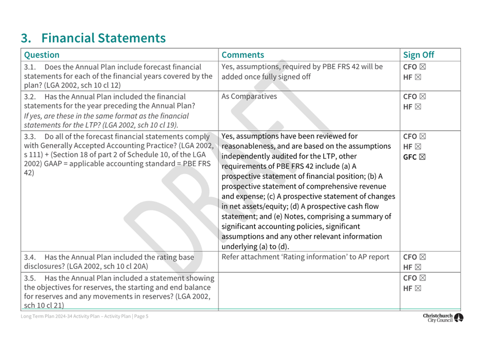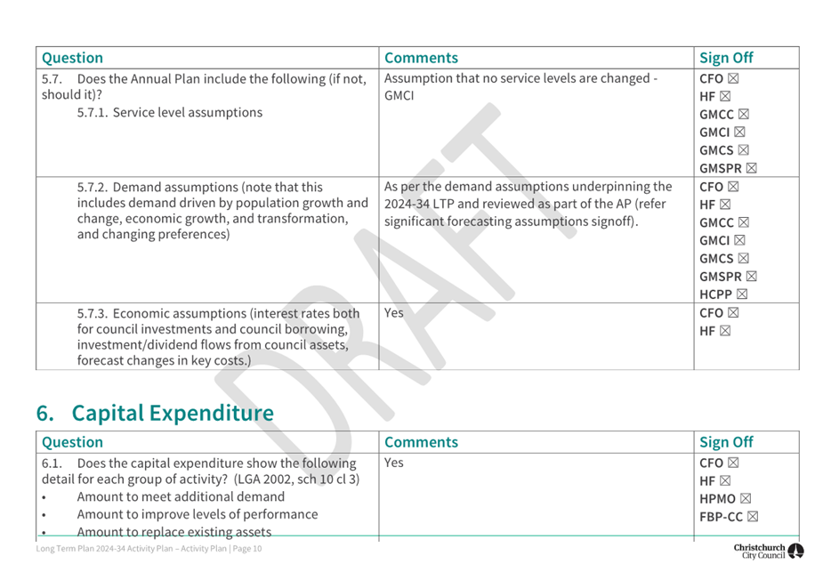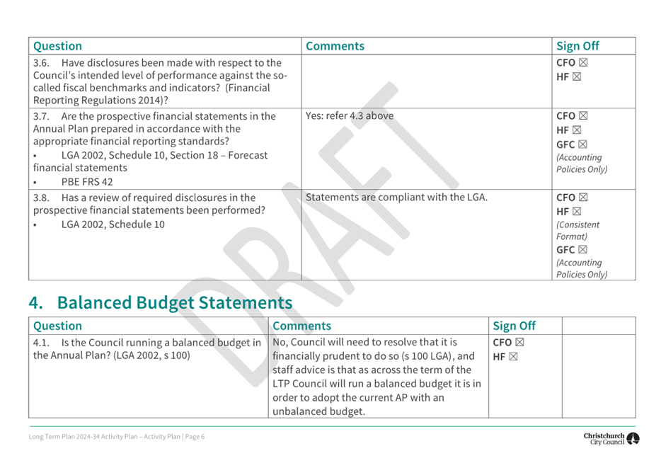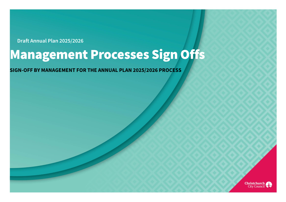3.10 Having received this specific direction from Councillors, staff proceeded to build the report and attachments for the Draft Annual Plan 2025/26. The process for preparing this information has been the subject of a detailed series of management sign offs – including signoffs by members of the Executive Leadership Team - that demonstrate compliance with the Council’s statutory, financial, and legal obligations. The management process and significant assumptions checklists and sign-off schedules are attached to this report (refer Attachments A and B).