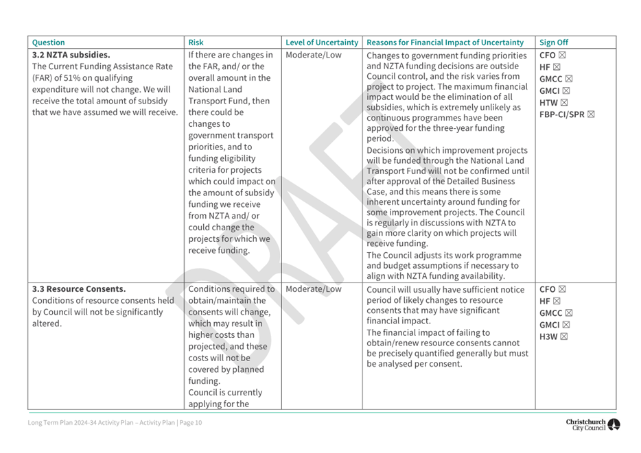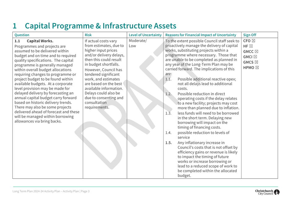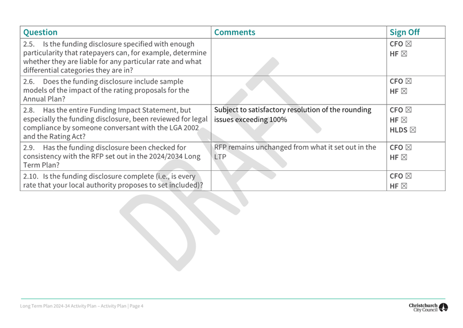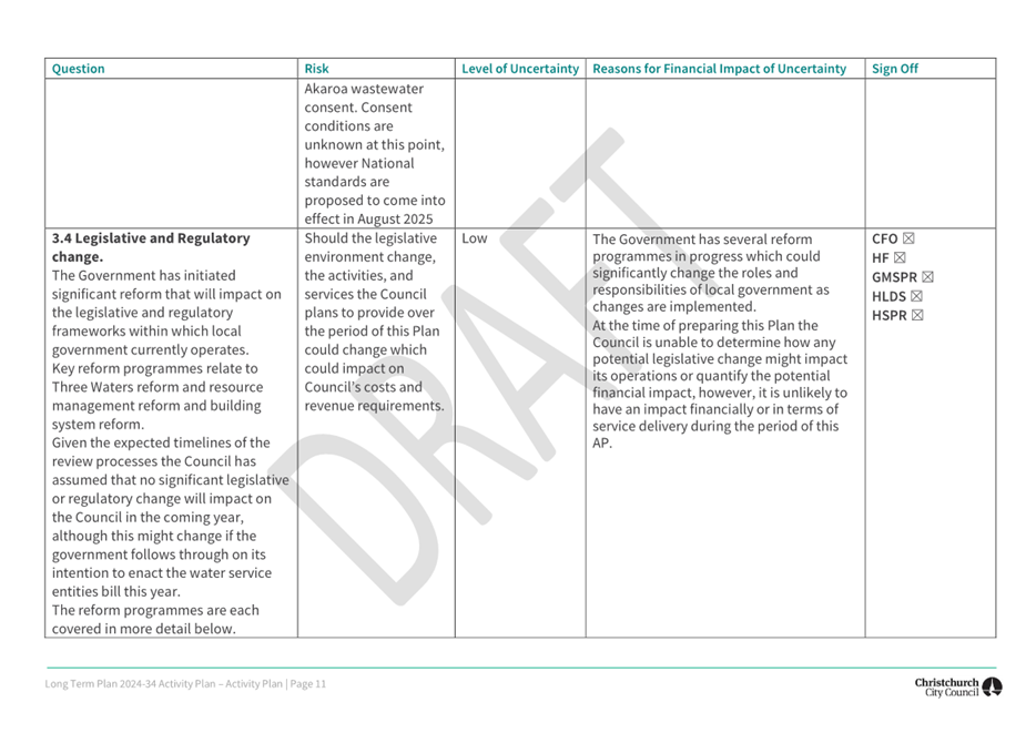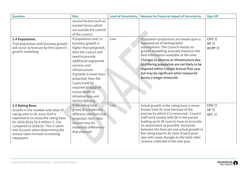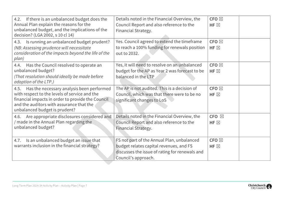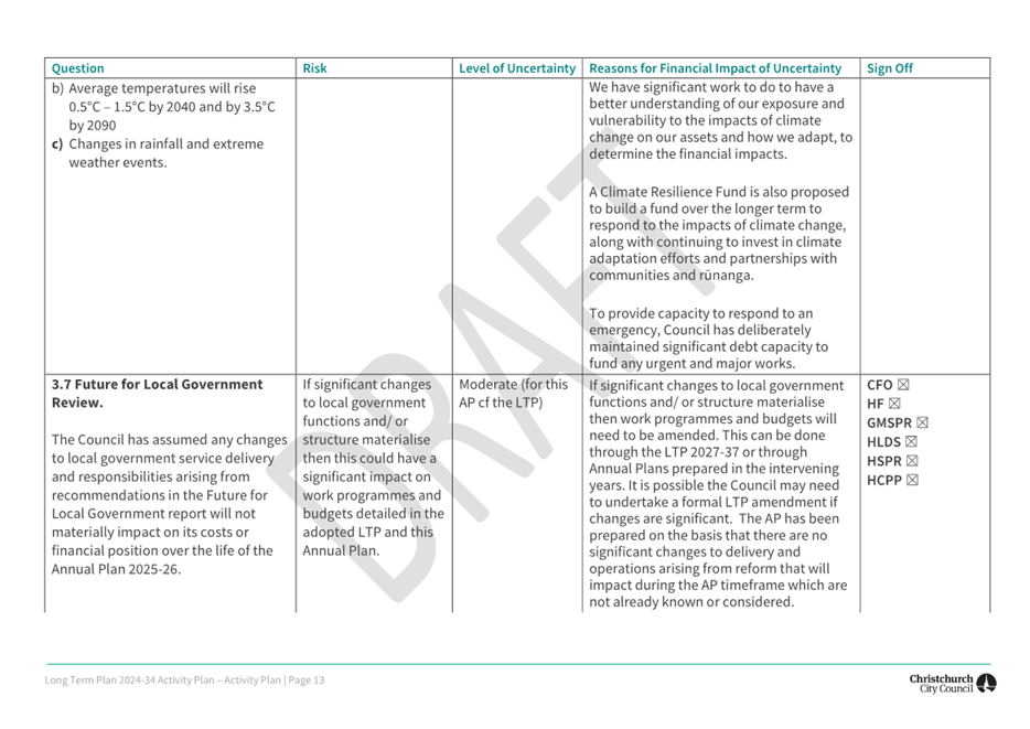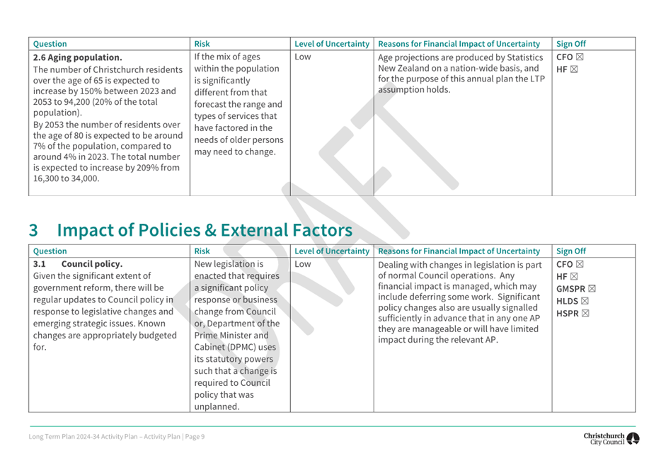 3.10 Having received this specific direction from Councillors, staff proceeded to build the report and attachments for the Draft Annual Plan 2025/26. The process for preparing this information has been the subject of a detailed series of management sign offs – including signoffs by members of the Executive Leadership Team - that demonstrate compliance with the Council’s statutory, financial, and legal obligations. The management process and significant assumptions checklists and sign-off schedules are attached to this report (refer Attachments A and B).