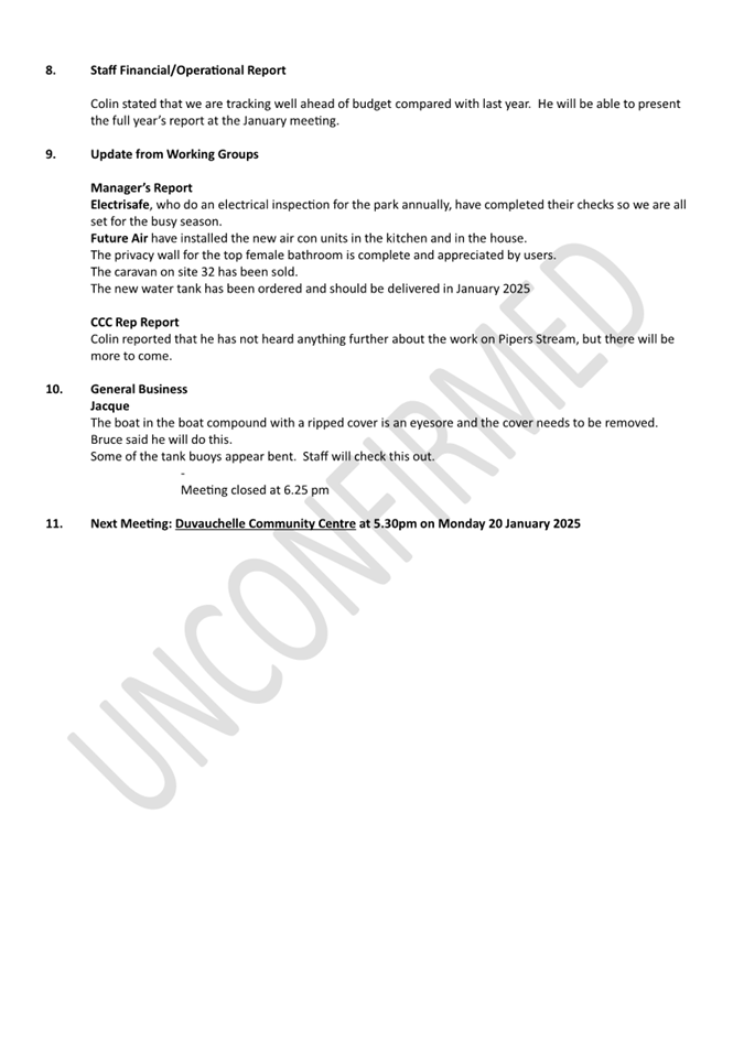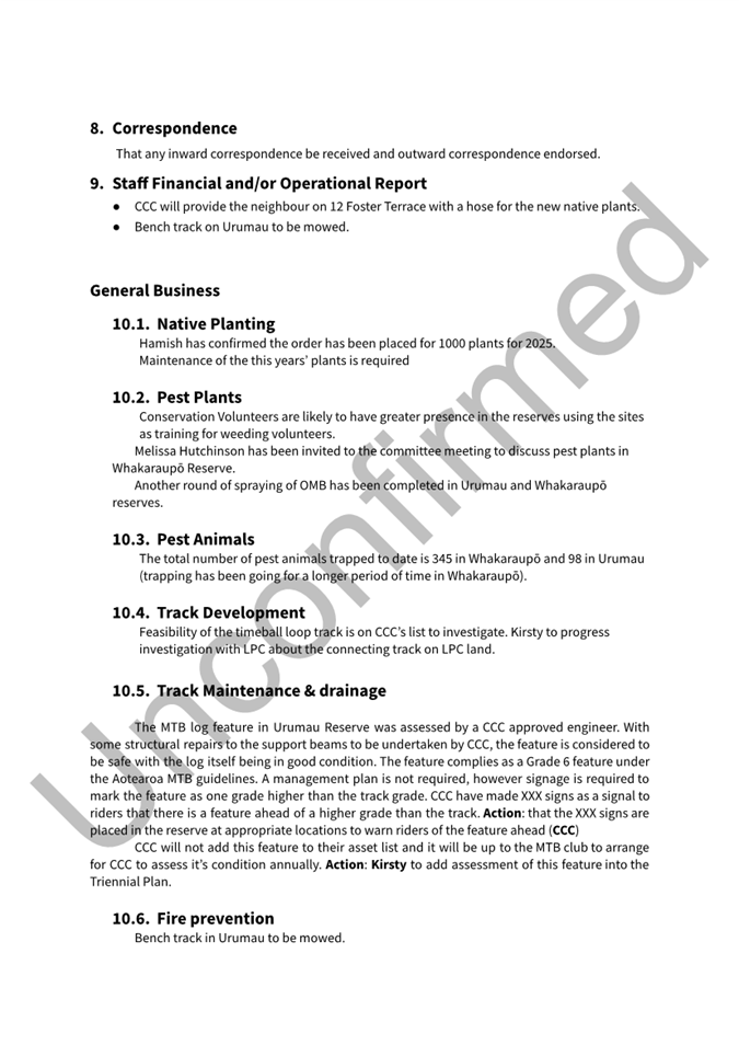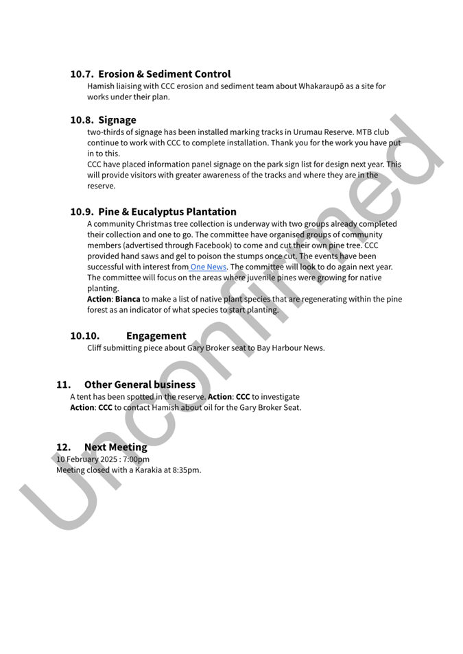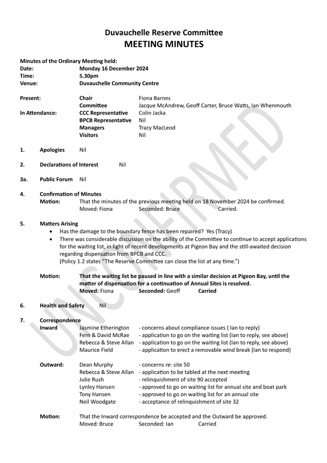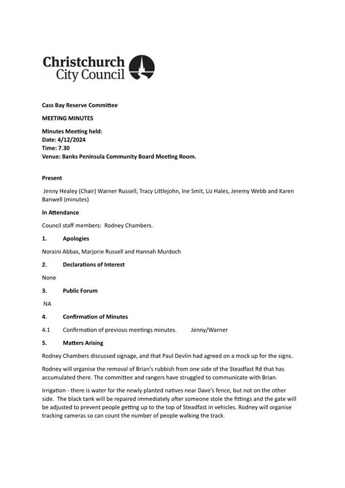 Community Board Resolved BKCB/2024/00091 Officer recommendations accepted without change Part B That Te Pātaka o Rākaihautū Banks Peninsula Community Board: 1. Receives the minutes of the following Reserve Committees: a. Le Bons Bay Reserve Committee Unconfirmed Minutes 10 November 2024 b. Lyttelton Reserve Committee Unconfirmed Minutes 11 November 2024 c. Robinsons Bay Reserve Committee Unconfirmed Minutes 10 November 2024 d. Stanley Park Reserve Committee Unconfirmed Minutes 20 November 2024 e. Lyttelton Recreation Grounds Reserve Committee Unconfirmed Minutes 18 November 2024 f. Duvauchelle Reserve Committee Unconfirmed Minutes 18 November 2024 g. Pigeon Bay Reserve Committee Unconfirmed Minutes 18 November 2024 h. Awaiti Reserve Committee Unconfirmed Minutes 27 November 2024 2. Approves appointment to the Le Bons Bay Reserve Committee of Michelle Rodgers and Tim Matthews. 3. Approves appointment to the Stanley Park Reserve Committee of Sarah Ott, Adam Martin, Pam Whyte and Dave Whyte. 4. Notes the resignation of the Lyttelton Reserves Committee chairperson, Helen Shaw and acknowledge her service to the Committee. 5. Notes the election of a new Chairperson for Robinsons Bay Reserve Committee, Karen Watson and acknowledge the outgoing Chairperson, Suky Thompson, for her service. 6. Notes the resignation of Chris Pottinger from the Robinsons Bay Reserve Committee. Lyn Leslie/Tyrone Fields Carried |