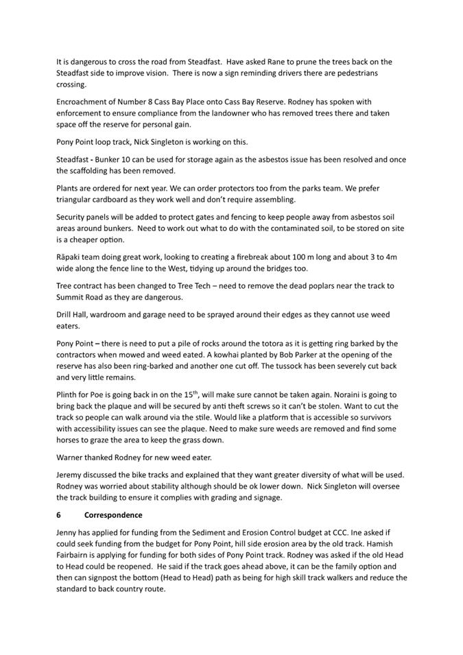 Alison Ross, local resident, spoke to the Board about the felling of a Macrocarpa tree on the top track of Corsair Bay, that Sycamore trees need to be identified as a pest species, and there needs to be a more nuanced approach for pest control and habitat management. Ms Ross highlighted some background reading that the Board members may like to read. Ms Ross voiced her concern about the current works on the retaining wall adjacent to 47 Dublin Street and the lack of a safety area and there had been no communication to residents about the works. Ms Ross commented on the possibility of the road bay space to allow vehicles to pass may be compromised during the works. |