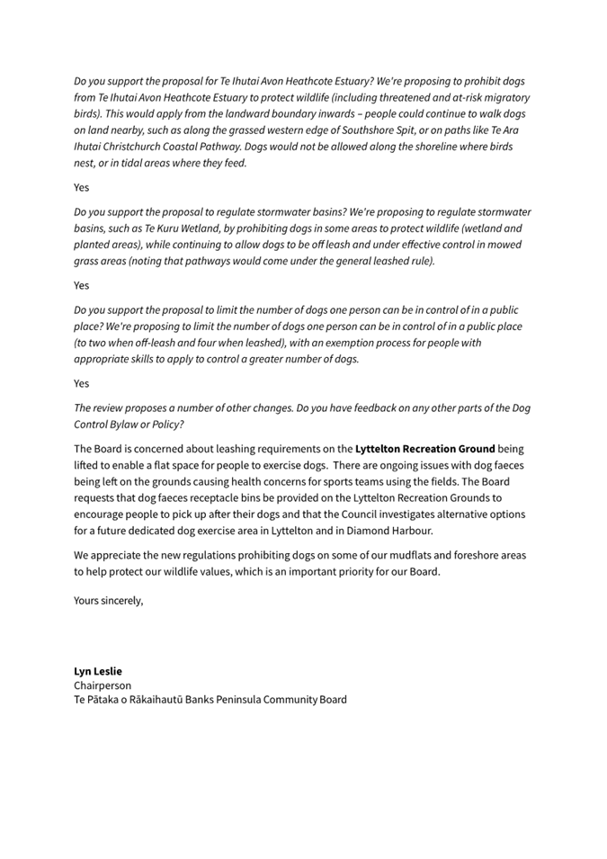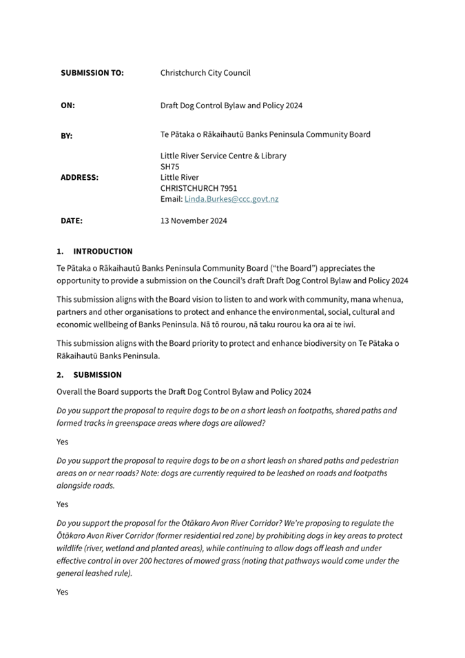 Submission - Draft Dog Control Bylaw and Policy 2024 - Te Pātaka o Rākaihautū Banks Peninsula Community Board |