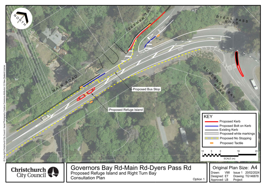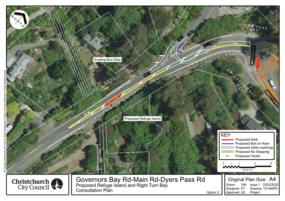 Three options have been considered by staff previously. The proposed treatment at the Dyers Pass Road / Governors Bay Road / Main Road intersection also includes a pedestrian crossing improvement at the Main Road/Zephyr Terrace intersection.