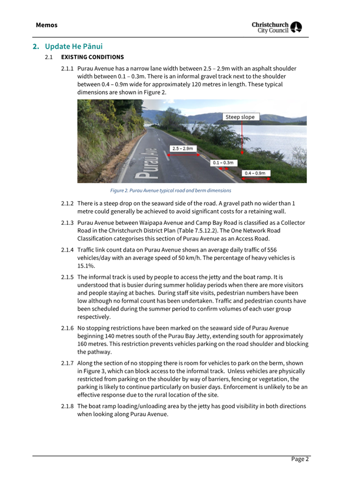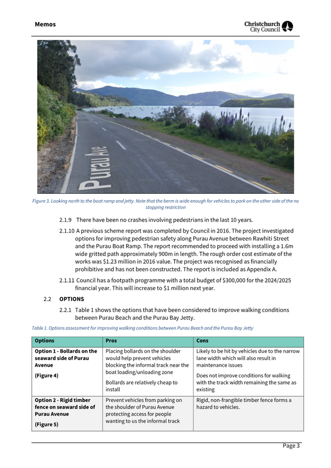 3.       Beach Road – Aylmers Valley to Hempleman Drive pedestrian safety improvements. The Board has requested that staff review the condition of the seaward grass verge along Beach Road from the Boat Club to the Yacht Club, which is a popular walking route frequently used by locals and tourists. The road is narrow and the grass often long and difficult to walk through, causing safety concerns when pedestrians walk along the road. Is there a possibility to provide a safe walking space for pedestrians.