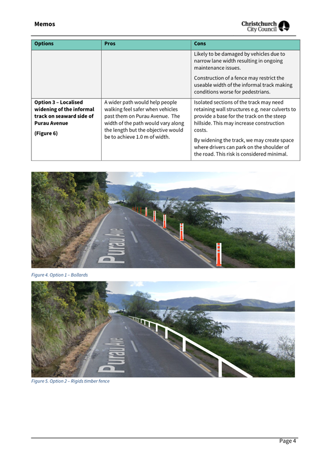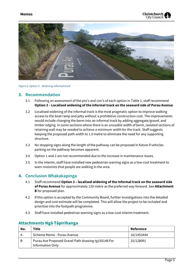 The Head to Head Working Party recommended that Te Pātaka o Rākaihautū Banks Peninsula Community Board approve Option 3: Localised widening of the informal track on seaward side of Purau Avenue. The cost estimate for Option 3 is $25,000.