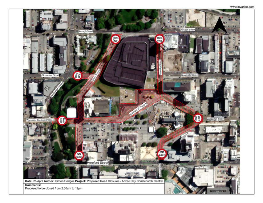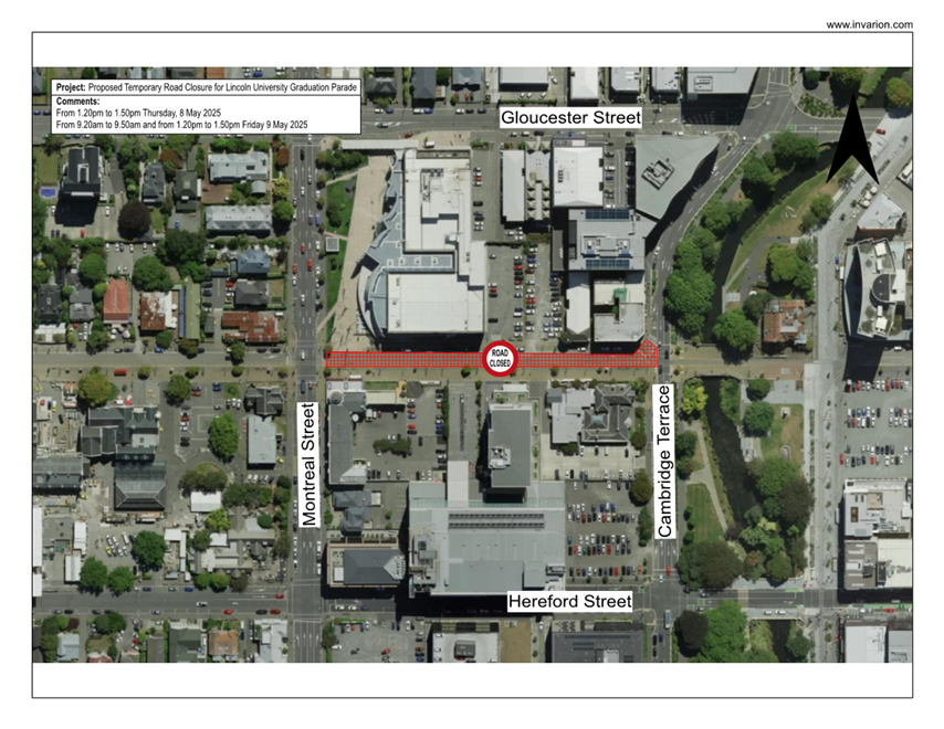 2. Authorises the approval of the temporary road closures for the Lincoln University Graduation Parade, proposed to be deployed on Worcester Street from Montreal Street to Cambridge Terrace: