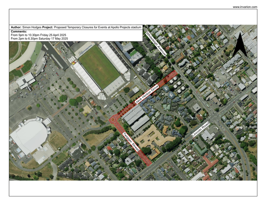 1.2 This report has been written because Venues Otautahi have proposed to close Jack Hinton Drive from Twigger Street to Whiteleigh Avenue and Twigger Street from Lincoln Road to Jack Hinton Drive on the dates and times listed below: