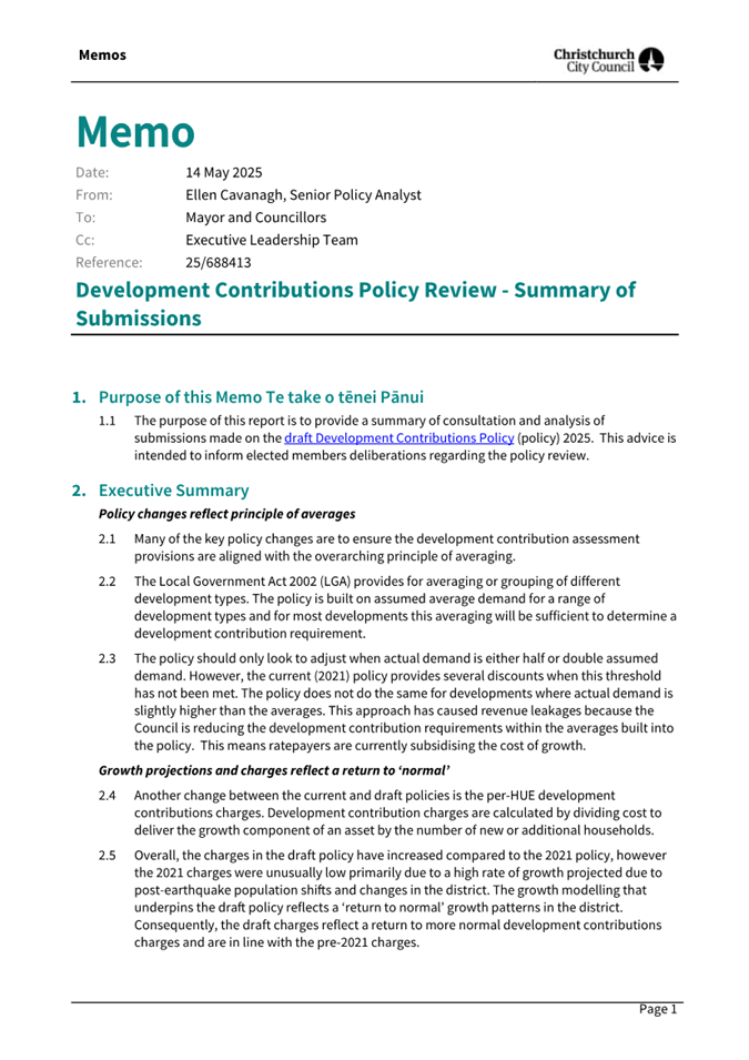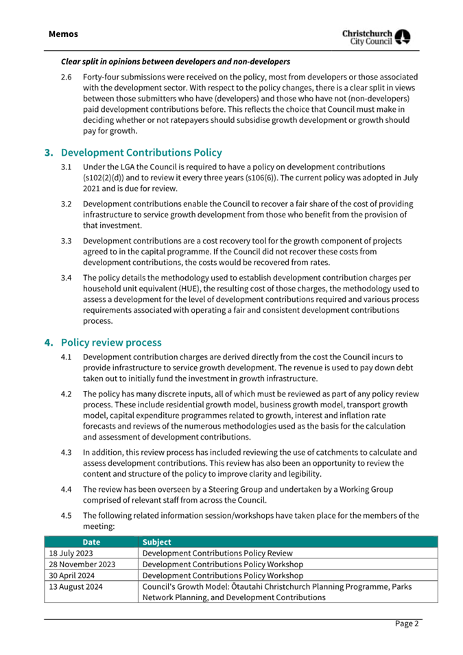 · The purpose of this workshop is to provide elected members with information and analysis of submissions made on the draft Development Contributions Policy (policy). This advice is intended to inform decision making with respect to the final policy. · Under the Local Government Act 2002 (LGA) the Council is required to have a policy on development contributions (s102(2)(d)) and to review it every three years (s106(6)). The current policy was adopted in July 2021 and is due for review. |