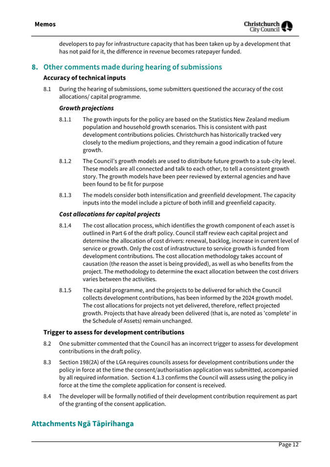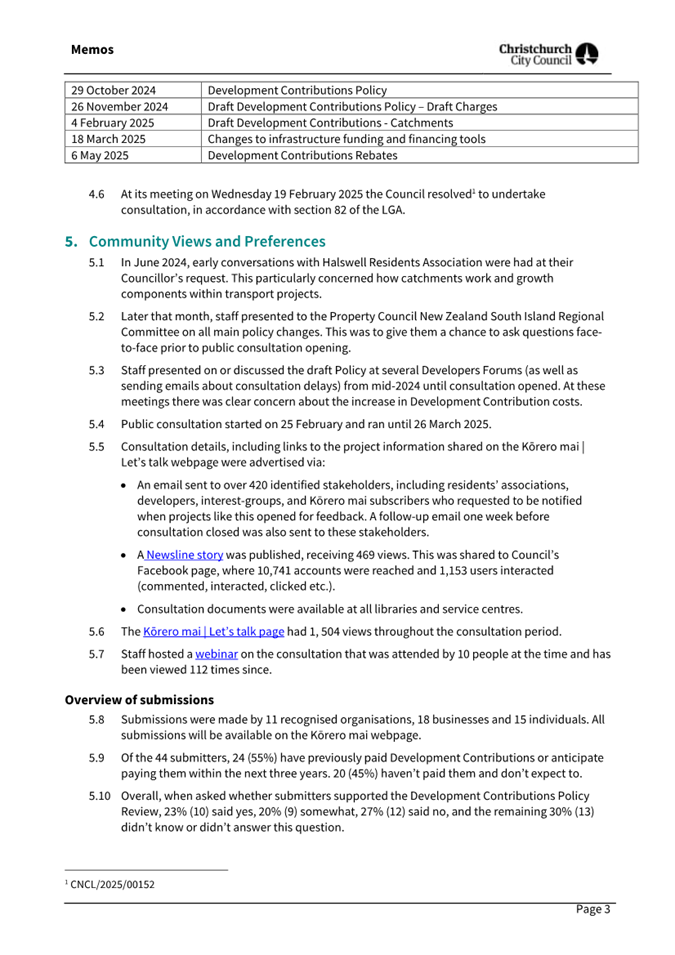 · The Council is legislatively required to have a policy on development contributions and to review that policy at least every three years. · The review of the policy began in mid-2023. The Council has received nine information sessions/workshops as part of this policy review (18 July and 28 November 2023, 30 April, 13 August, 29 October and 29 November 2024, 4 February, 18 March and 6 May 2025). · At its meeting on Wednesday 19 February 2025 the Council resolved[1] to undertake consultation on the draft policy, in accordance with section 82 of the LGA. · Public consultation started on 25 February and ran until 26 March. Forty-four submissions were received on the draft policy. · Submitters were heard in April as part of the Annual Plan hearings process. |