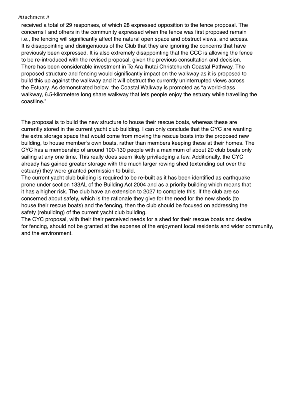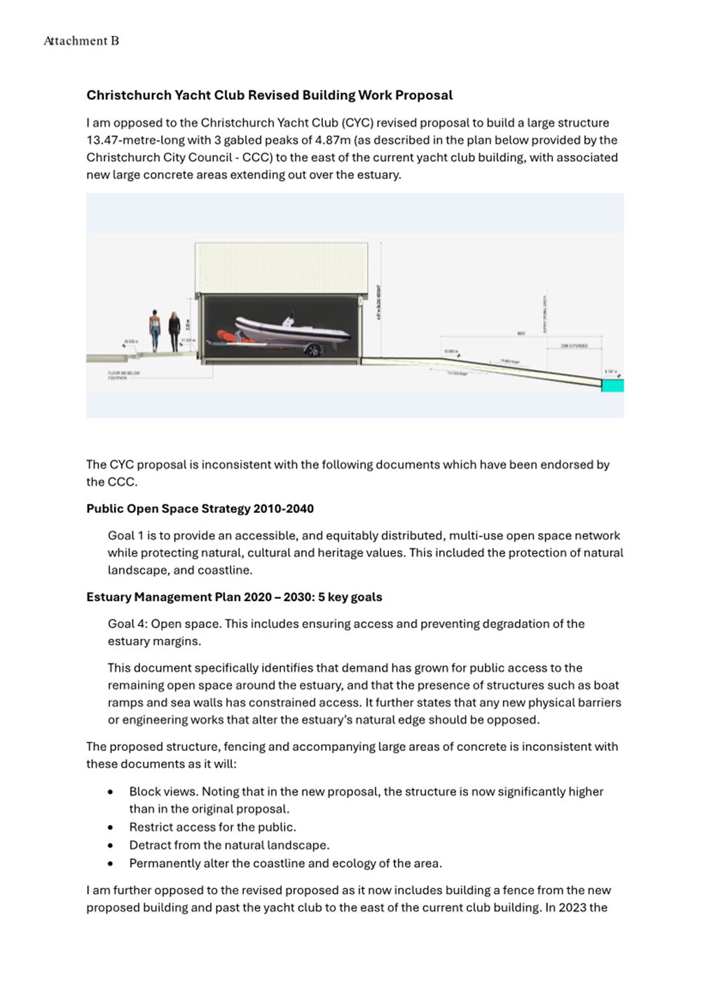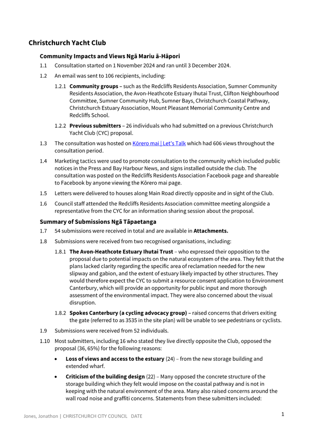 The Christchurch Yacht Club (the Club) hold deed of licence (LTO)Licence to occupy in perpetuity with the Christchurch City Council (the Council) for the exclusive use and occupation of the site at 239 Main Road, Moncks Bay. Under the LTO no buildings or other improvements shall be erected upon, or made to, the licensed property without the prior written consent of the Council, which delegation sits with the Community Board. The Club have been in correspondence with the Council since 2023 regarding their plans to develop the site to provide storage, security, fencing, and boat launching improvements. An application for a fence was made in 2023 and a further application for the storage building, boat ramp, and jetty improvements was made in 2024. Engagement regarding the original fencing proposal was undertaken in September 2023. Engagement regarding the building, ramp, and jetty improvements was undertaken in September 2024. There were two submissions from recognised organisations, being The Avon-Heathcote Estuary Ihutai Trust and Spokes Canterbury (a cycling advocacy group), both expressing concerns regarding the proposal. There were 52 individual submissions. 36 (65%) were received in opposition and 19 (35%) in support of the proposal. Following the initial engagement the Club made changes to their plans in an attempt to mitigate some of these concerns. Further engagement on the revised plans was undertaken with the submitters of both the fence and building proposals in April 2025. 15 responses were received on the further engagement, including five from individuals who hadn't previously submitted. All 10 original submitters maintained their opposition. Among the new respondents, four expressed support, while one opposed. A summary of submissions and the submission tables from these engagement processes have been attached for your information. |