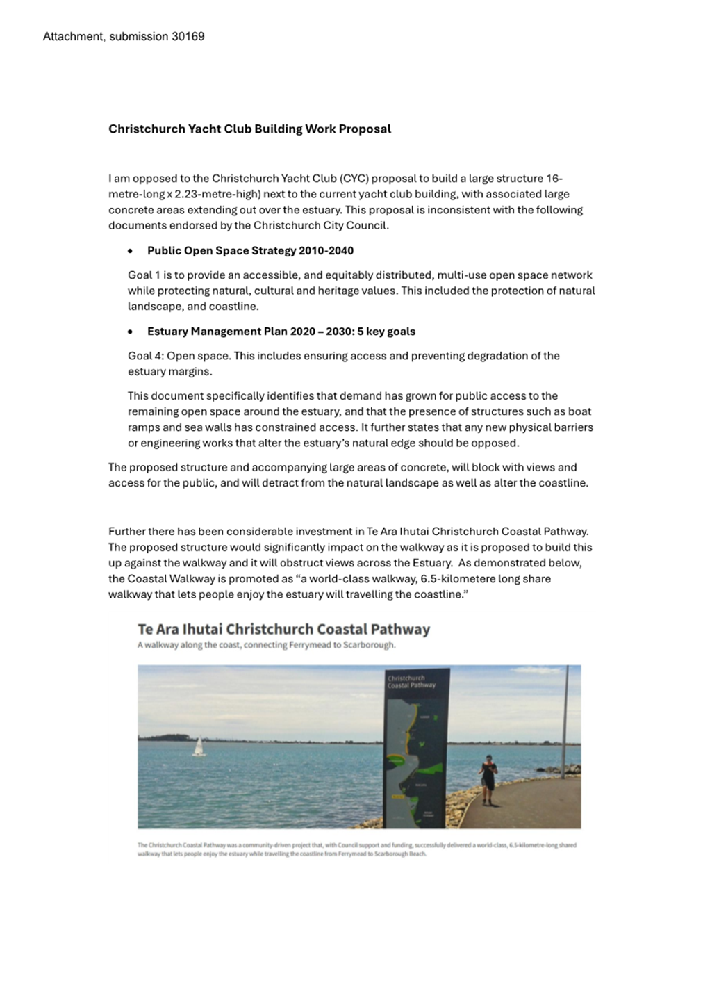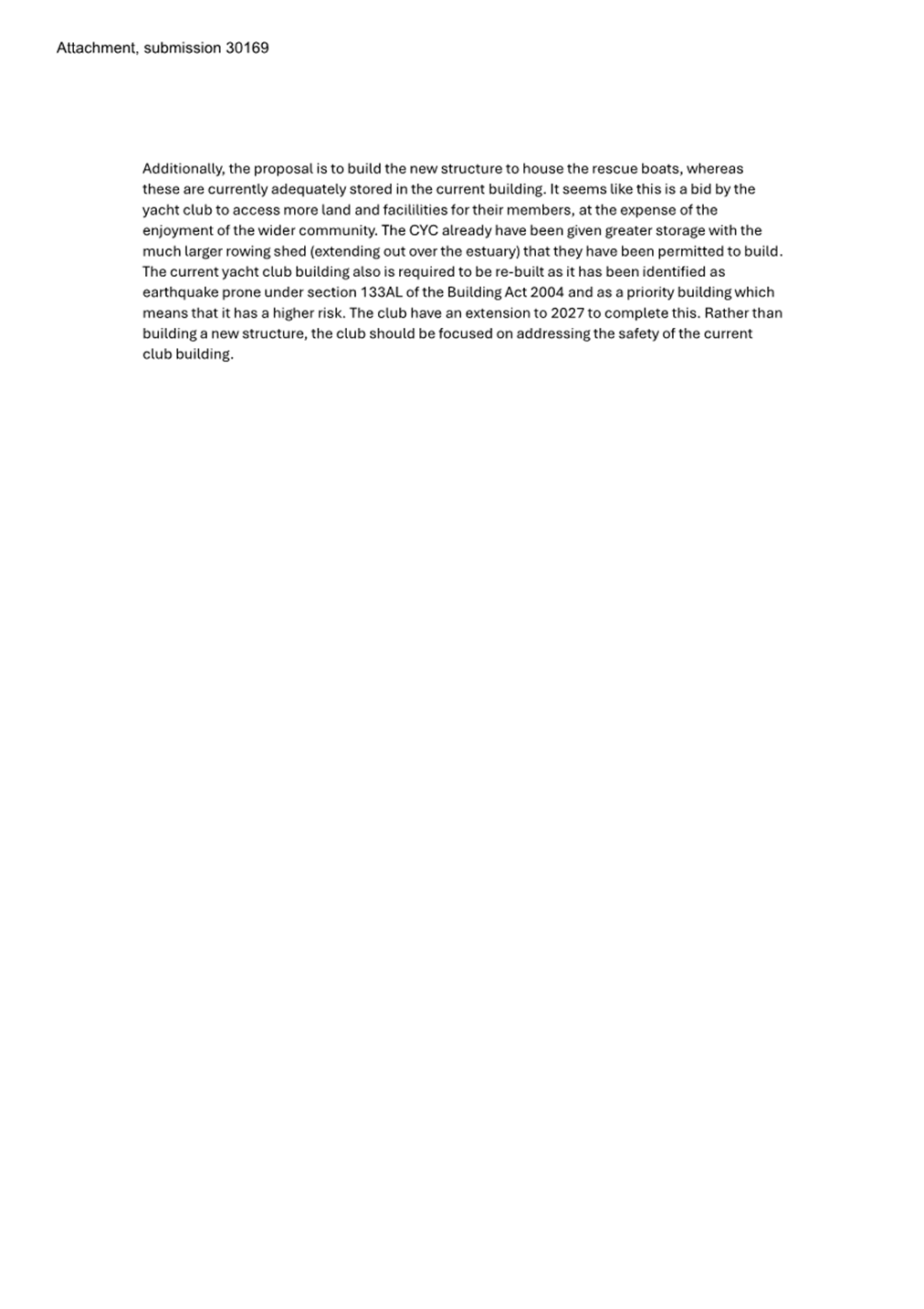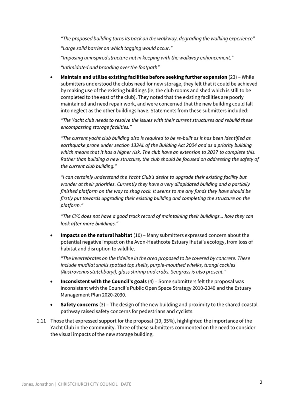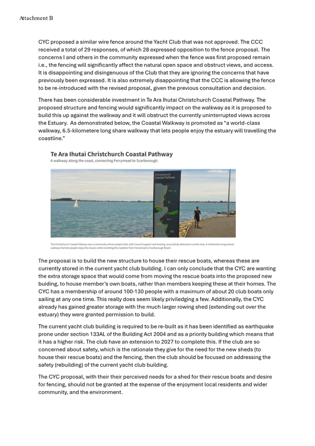 The Christchurch Yacht Club (the Club) hold deed of licence (LTO)Licence to occupy in perpetuity with the Christchurch City Council (the Council) for the exclusive use and occupation of the site at 239 Main Road, Moncks Bay. Under the LTO no buildings or other improvements shall be erected upon, or made to, the licensed property without the prior written consent of the Council, which delegation sits with the Community Board. The Club have been in correspondence with the Council since 2023 regarding their plans to develop the site to provide storage, security, fencing, and boat launching improvements. An application for a fence was made in 2023 and a further application for the storage building, boat ramp, and jetty improvements was made in 2024. Engagement regarding the original fencing proposal was undertaken in September 2023. Engagement regarding the building, ramp, and jetty improvements was undertaken in September 2024. There were two submissions from recognised organisations, being The Avon-Heathcote Estuary Ihutai Trust and Spokes Canterbury (a cycling advocacy group), both expressing concerns regarding the proposal. There were 52 individual submissions. 36 (65%) were received in opposition and 19 (35%) in support of the proposal. Following the initial engagement the Club made changes to their plans in an attempt to mitigate some of these concerns. Further engagement on the revised plans was undertaken with the submitters of both the fence and building proposals in April 2025. 15 responses were received on the further engagement, including five from individuals who hadn't previously submitted. All 10 original submitters maintained their opposition. Among the new respondents, four expressed support, while one opposed. A summary of submissions and the submission tables from these engagement processes have been attached for your information. |