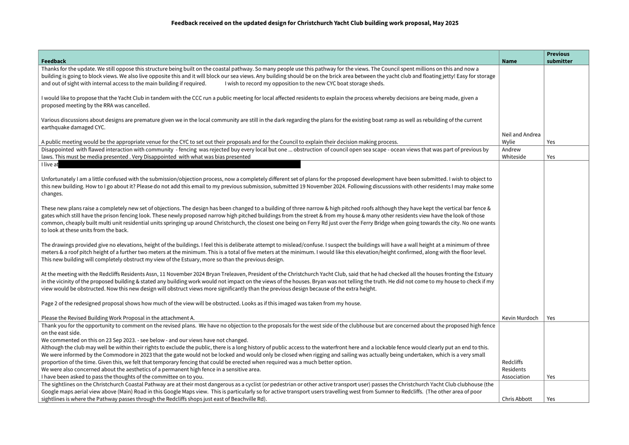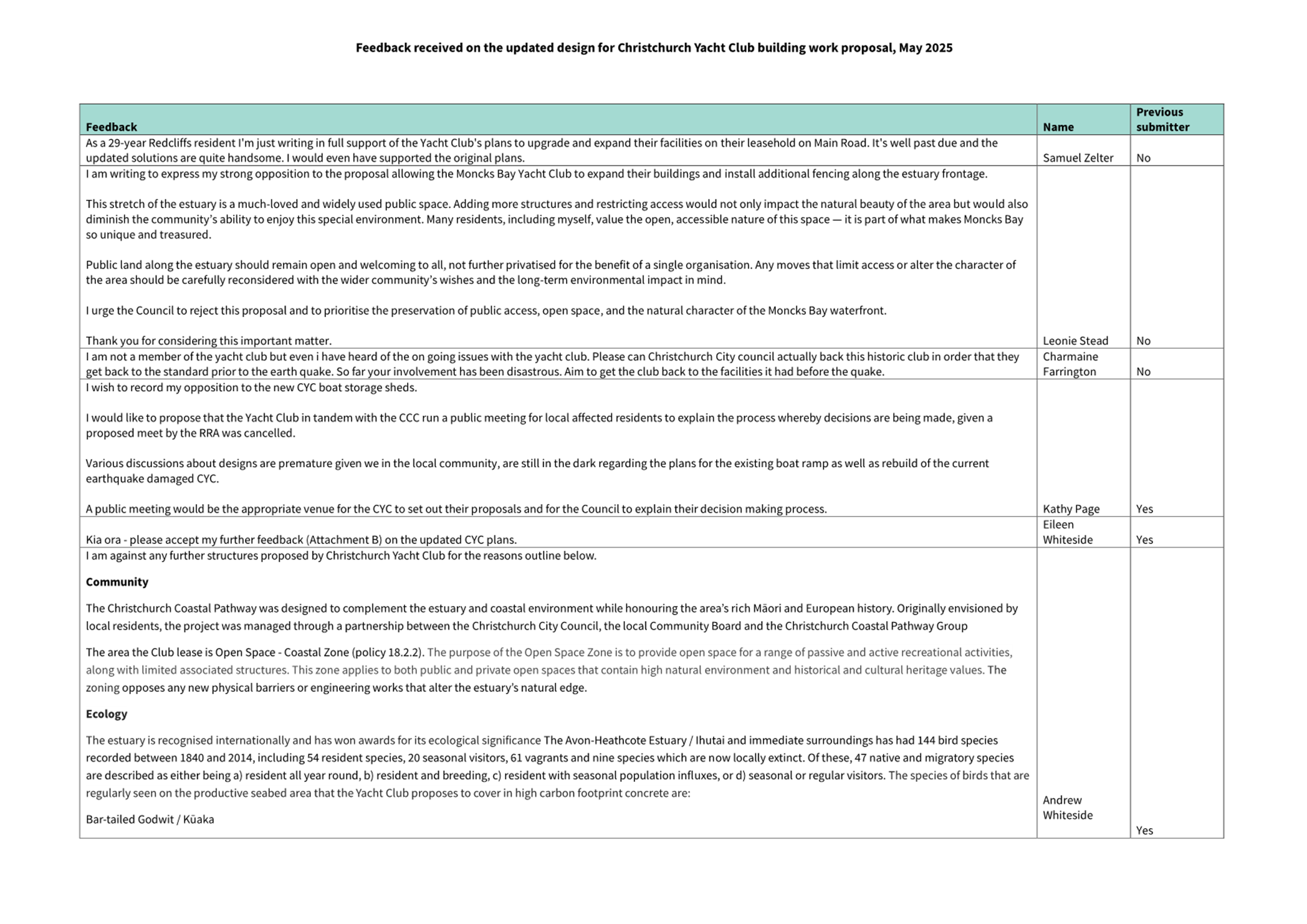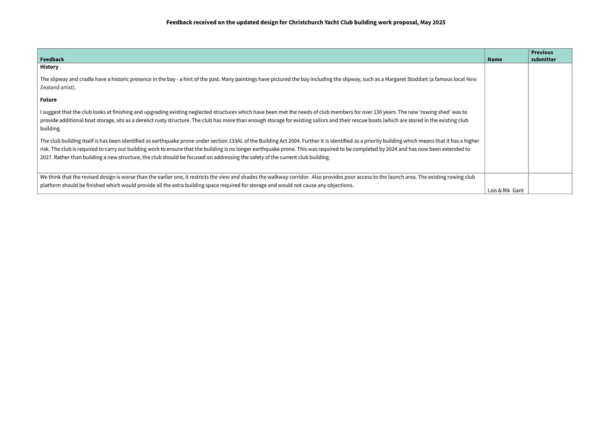 Christchurch Yacht Club - Further Submissions Table - May 2025 |