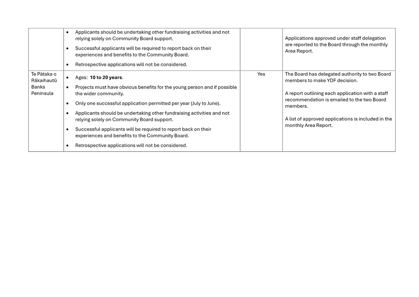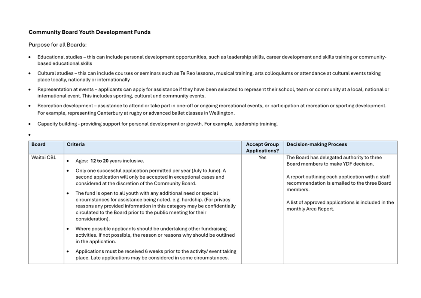 Each year the Council’s Community Boards set aside an amount of money to fund young people in their local community. Under this scheme, the Community Boards consider applications for a variety of activities. On average, successful applicants to the fund have received around $300 from the community boards. At the request of the Board, staff have compared the Waihoro YDF criteria to the 5 other Community Boards to identify whether improvements can be made around the criteria and decision-making process. |