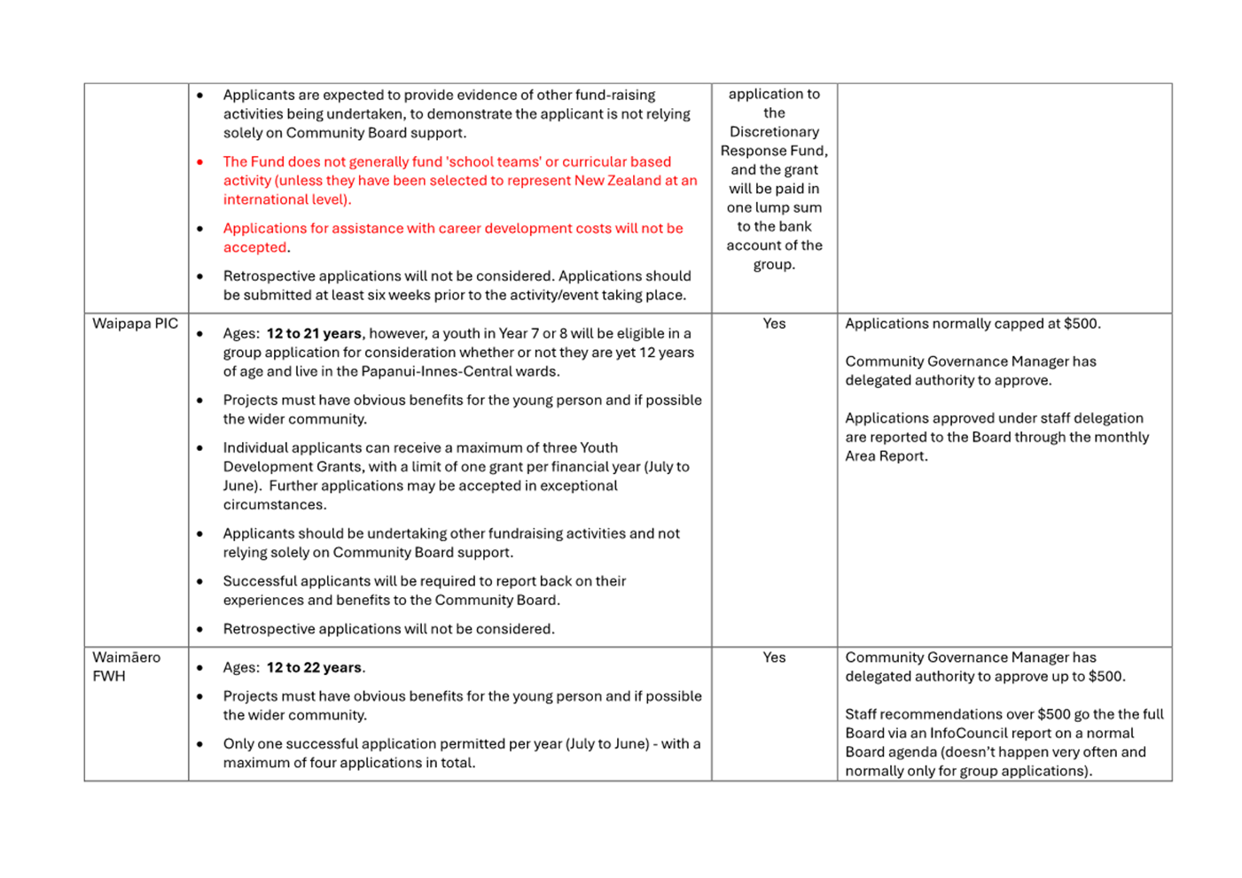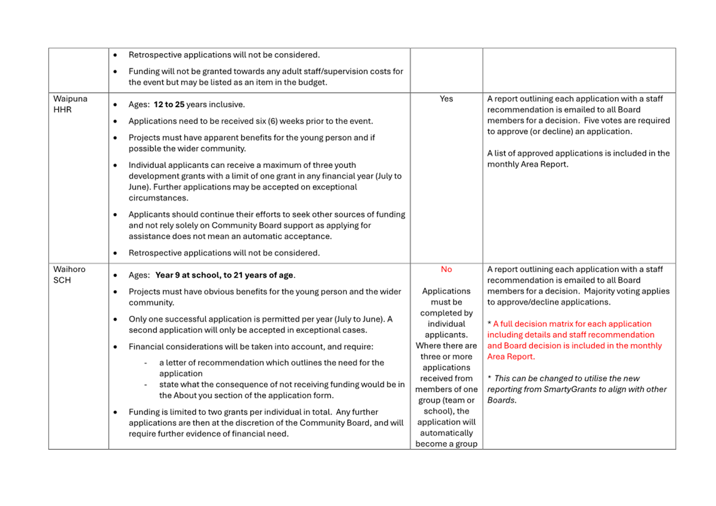 The below identifies the key differences between the Waihoro Community Board and the other Community Boards: · Criteria: Does not fund ‘school teams’ or curricular based activities (unless they have been selected to represent New Zealand at an international level). · Criteria: Applications for assistance with career development costs are not accepted. · Criteria: Does not accept group applications. · Decision-making process: A full decision matrix for each application including details and staff recommendation and Board decision is included in the monthly Area Report. |