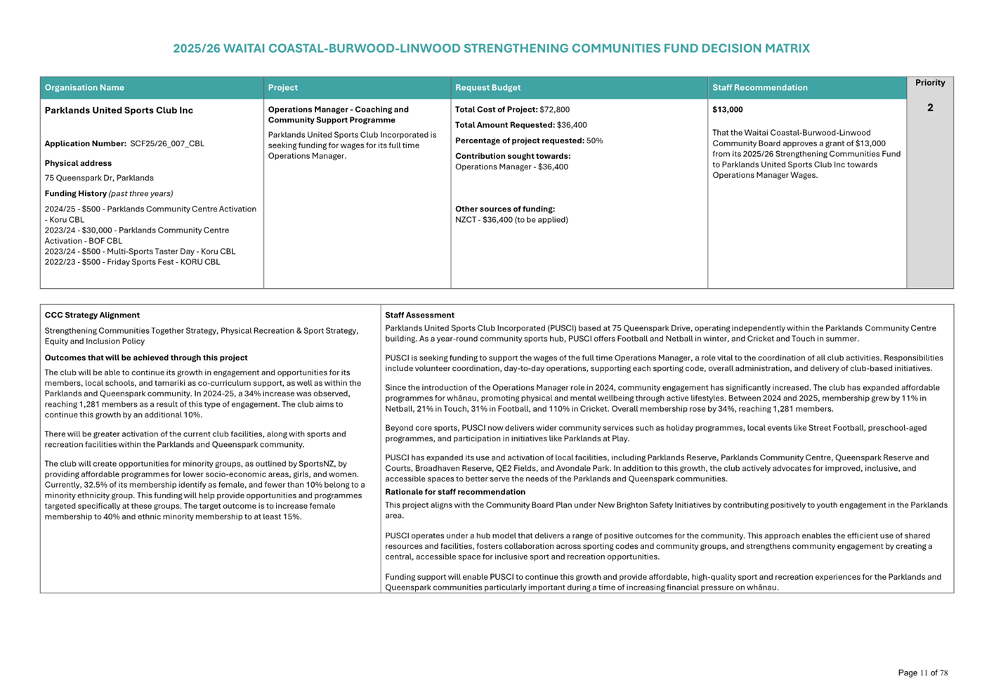 That the Waitai Coastal-Burwood-Linwood Community Board approves a grant of $13,000 from its 2025/26 Strengthening Communities Fund to Parklands United Sports Club Inc towards Operations Manager Wages. |