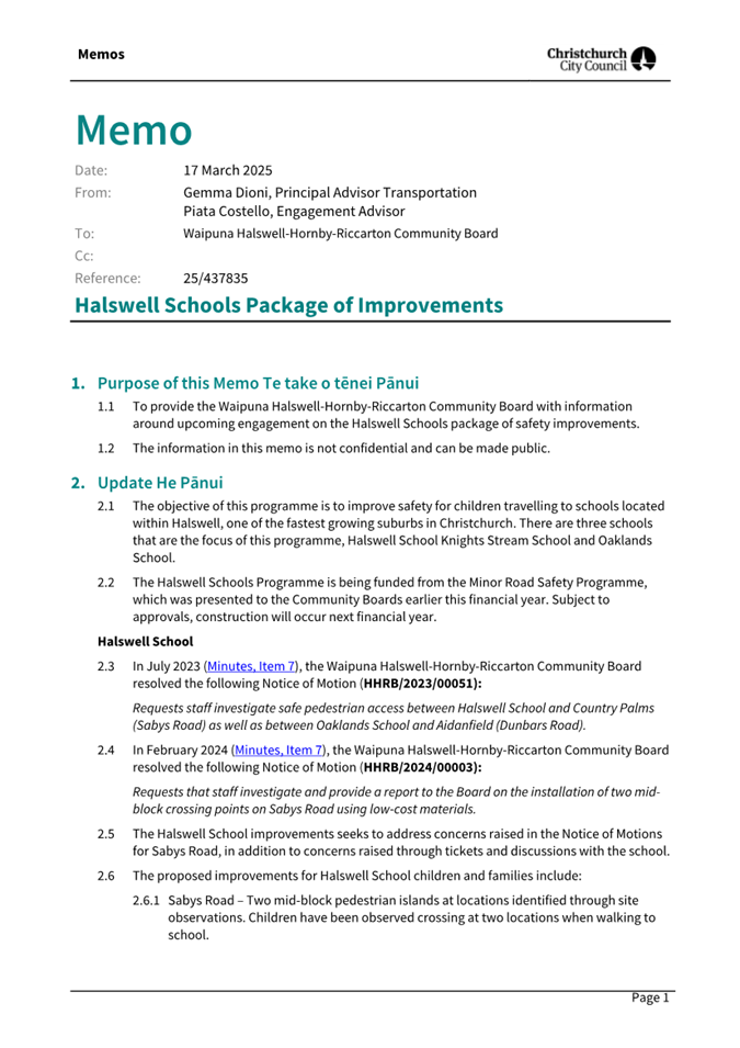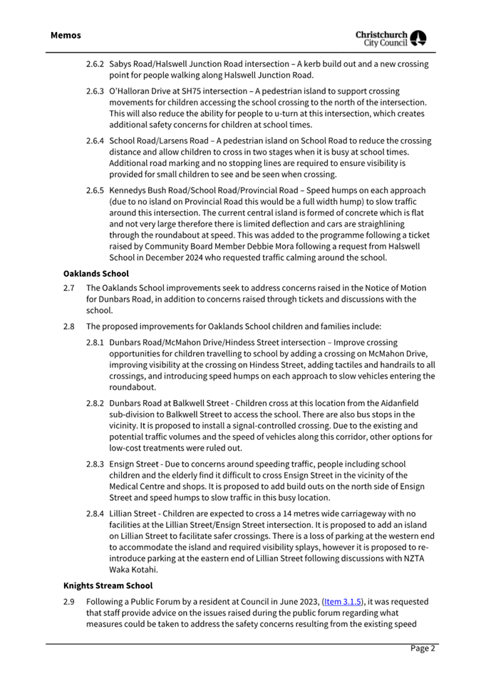 12. Knights Stream School Safety Improvement - Signalised Crossing on Halswell Junction Road............................................................................................................ 137