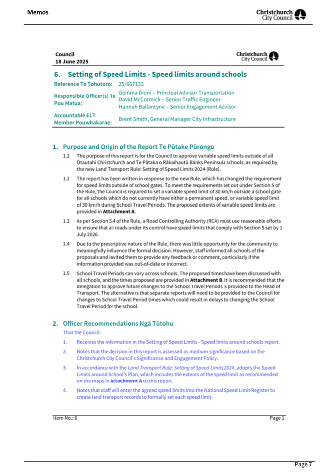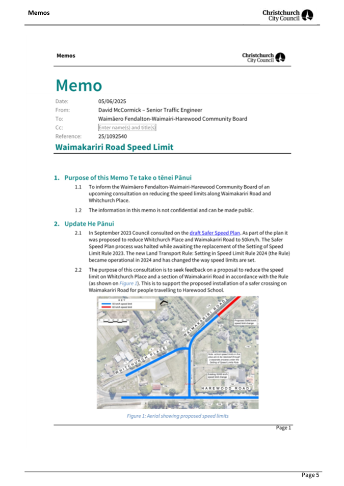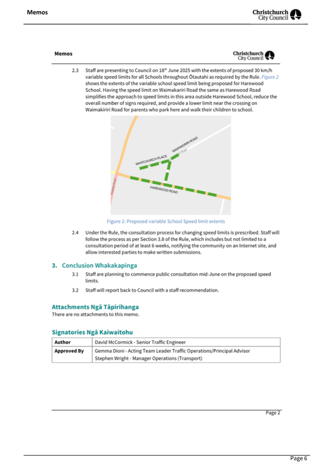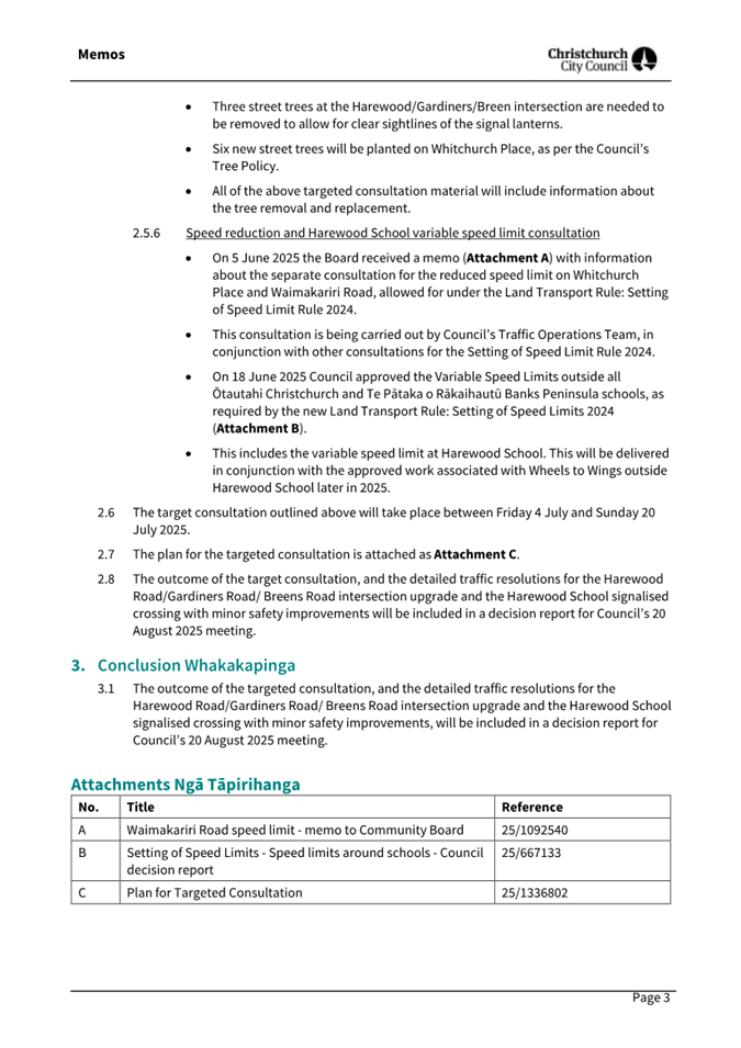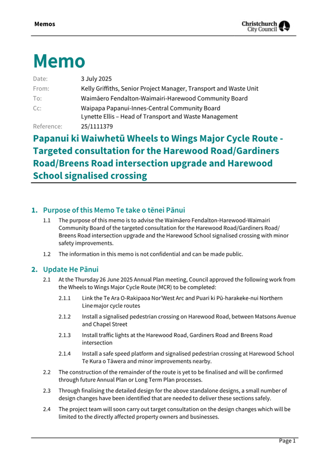 4.7 Memo - Targeted consultation for the Harewood Road/Gardiners Road/Breens Road intersection upgrade and Harewood School signalised crossing (circulated 4 July 2025 - refer to Attachment C)