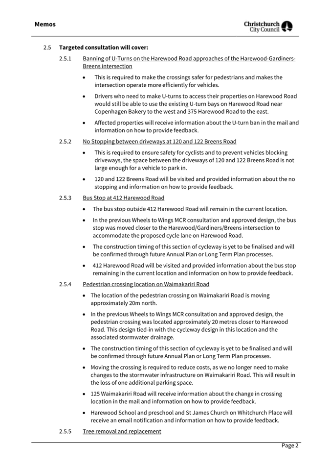 MEMO - Targeted consultation for the Harewood Road/Gardiners Road/Breens Road intersection upgrade and Harewood School signalised crossing |