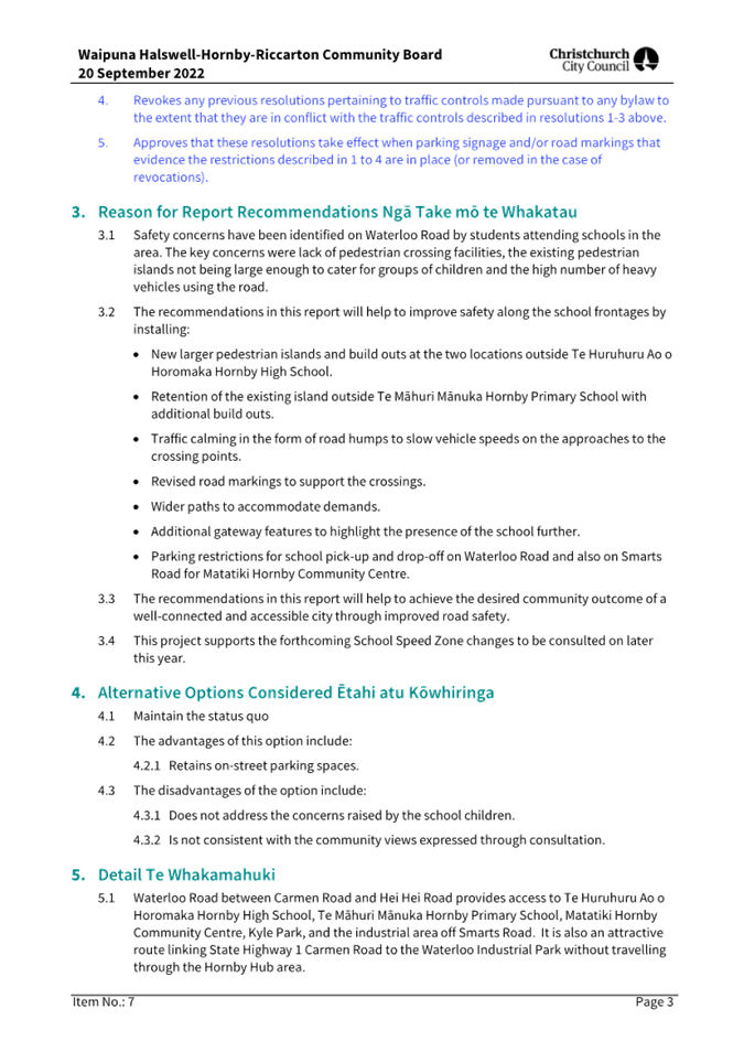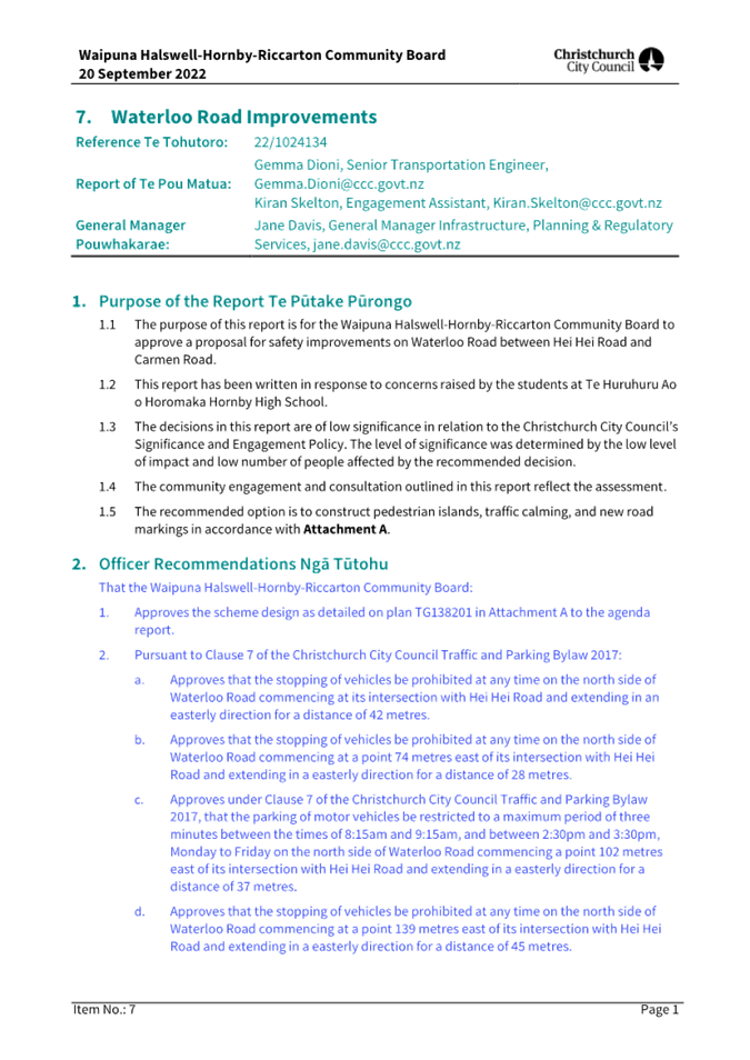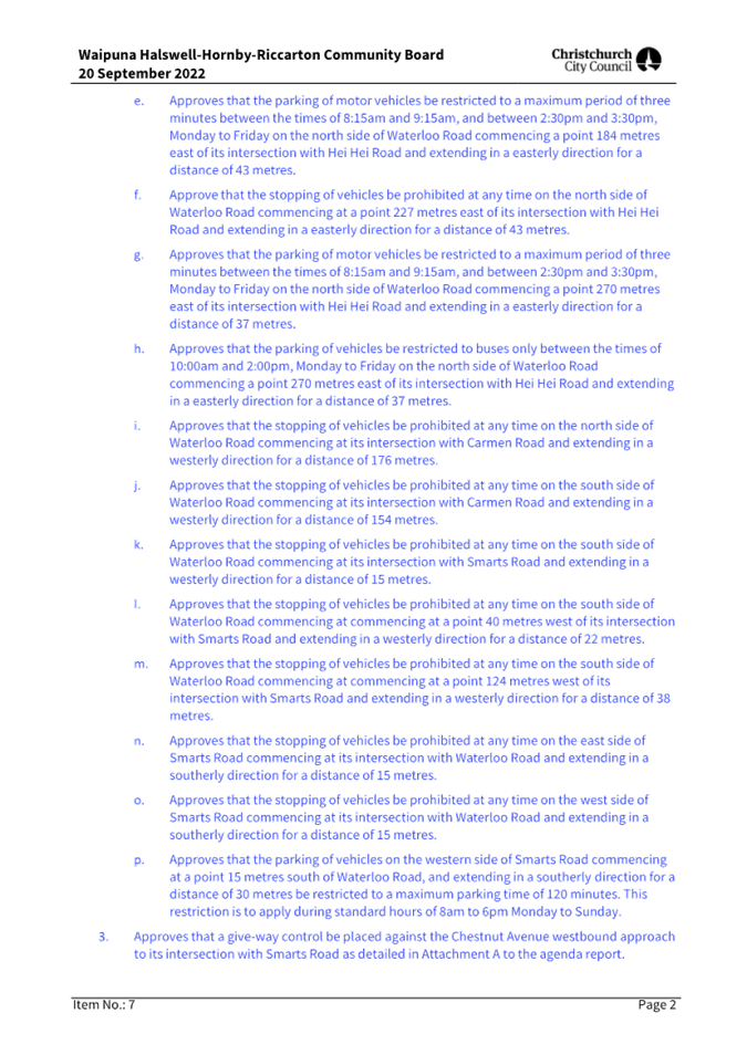 Community Board Resolved HHRB/2026/00015 Officer recommendation accepted without change Part B That the Waipuna Halswell-Hornby-Riccarton Community Board: 1. Receives the correspondence from Megan Woods, Member of Parliament for Wigram, in relation to the Waterloo Road, Gilberthorpes Road, Parker Street, and Moffett Street intersection. Mark Peters/Cody Cooper Carried |