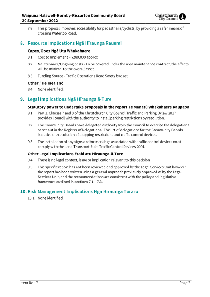 Community Board Resolved HHRB/2026/00018 Officer recommendations accepted without change Part C That the Waipuna Halswell-Hornby-Riccarton Community Board: 1. Receives the information in the Tiora Place - Proposed No Stopping Restrictions Report. 2. Notes that the decision in this report are assessed as low significance based on the Christchurch City Council’s Significance and Engagement Policy. 3. Under Clause 6(2) of the Christchurch City Council Traffic and Parking Bylaw 2017 revokes any previous resolutions pertaining to traffic controls made pursuant to any bylaw to the extent that they are in conflict with the parking or stopping restrictions described in resolutions 4a – 4c below. 4. Approves pursuant to Clause 7 of the Christchurch City Council Traffic and Parking Bylaw 2017 that: a. the stopping of all vehicles be prohibited at any time, on the south-eastern side of Tiora Place commencing at its intersection with Auburn Avenue, and extending in a south-westerly direction for a distance of 39.5 metres as shown on Plan TG151652, dated 22/12/2025 as shown on Attachment A to the report on the meeting agenda. b. the stopping of all vehicles be prohibited at any time, on the south-eastern side of Tiora Place commencing at a point 44.5 metres from the intersection with Auburn Avenue, extending first in a south-westerly direction, then following the kerb in a clockwise direction, around the cul-de-sac head, then extending in a north-easterly direction for a distance of 46 metres as shown on Plan TG151652, dated 22/12/2025 as shown on Attachment A to the report on the meeting agenda. c. the stopping of all vehicles be prohibited at any time, on the south-eastern side of Tiora Place commencing at a point 95.5 metres from the intersection with Auburn Avenue, extending first in a south-westerly direction, then following the kerb in a clockwise direction, around the cul-de-sac head, then extending in a north-easterly direction for a distance of four metres as shown on Plan TG151652, dated 22/12/2025 as shown on Attachment A to the report on the meeting agenda. 5. Approves that these resolutions take effect when parking signage and/or road markings that evidence the restrictions described in 3 and 4 are in place (or removed in the case of revocations). Tyla Harrison-Hunt/Cody Cooper Carried |