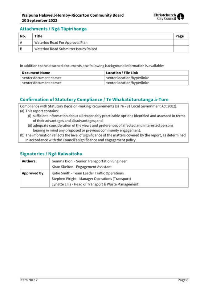Bailey Peterson - Manager Community Governance, Halswell-Hornby-Riccarton Matthew McLintock - Manager Community Governance Team John Filsell - Head of Community Support and Partnerships |