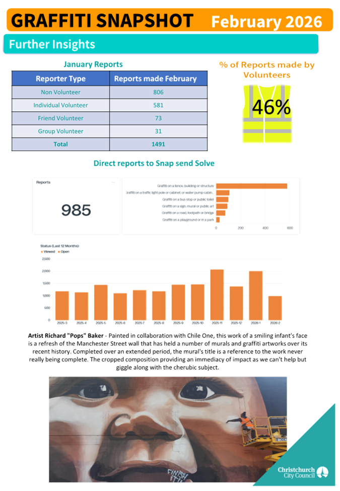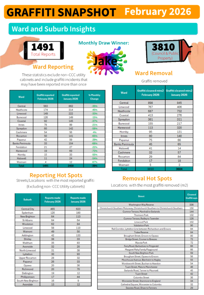 The Graffiti Snapshot for February 2026 can be found as Attachment C to this report. The Council also provides information on graffiti, including tips to prevent it, and about becoming a Graffiti Programme volunteer, at this link.